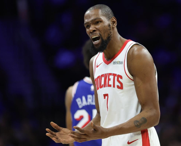这一次杜兰特也是拼尽全力,第三节连续命中三分帮助火箭迫近分差,末节关键时刻也站出来帮助球队稳定局势,可惜加时赛没有延续。全场打了44分钟,21投13中,三分8投5中,罚球6罚5中,得到36分7篮板3助攻,不过也出现了高达8次失误,正负值-15。身边队友状态都不太好,申京14中5拿到13分8篮板7助攻,正负值-18,被恩比德直接打爆。